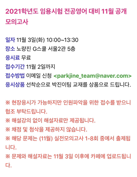 지스쿨 박진이팀 전공영어 11월 공개 모의고사 작성자Dio Jin 교수|작성시간20.10.31|조회수30 목록 댓글 0 글자크기 작게가 글자크기 크게가 G스쿨 박진이팀 2021학년도 임용시험 전공영어 대비11월 공개 모의고사 2020년 11월 3일 오전 10시-오후 1시 30분 다음검색 현재 게시글 추가 기능 열기 북마크 공유하기 신고 센터로 신고 댓글 댓글 0 댓글쓰기 답글쓰기 댓글 리스트