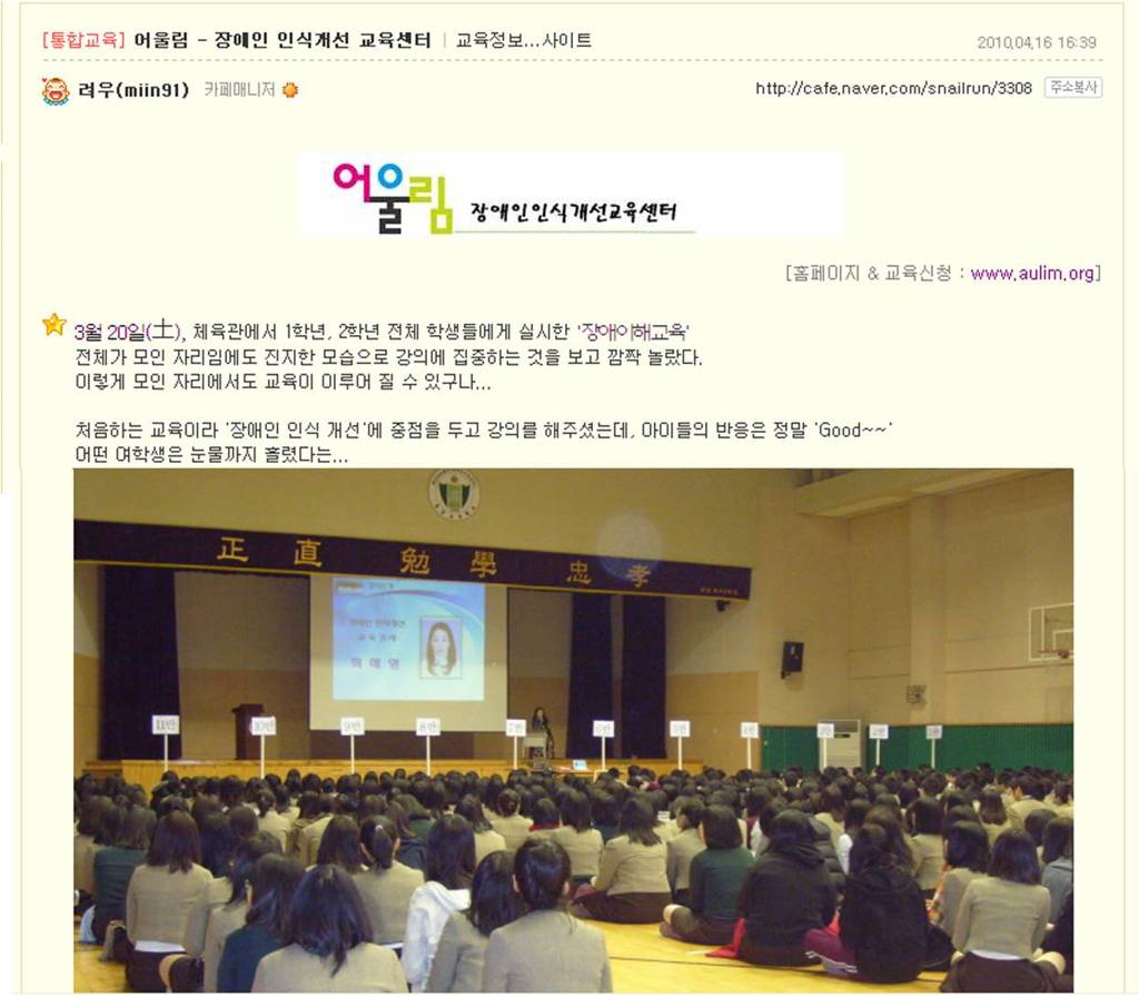 우리 교육에 대한 소감이 올라왔어요~^^* 작성자유진이|작성시간10.04.25|조회수86 목록 댓글 2 글자크기 작게가 글자크기 크게가 우리 교육에 대한 소감이 올라왔어요~ 뿌듯합니다. 더 분발해서 교육에 열의를 다해야 겠다는 다짐이 생깁니다. ^^* http://cafe.naver.com/snailrun/3308 다음검색 현재 게시글 추가 기능 열기 북마크 공유하기 신고 센터로 신고 댓글 댓글 2 댓글쓰기 답글쓰기 댓글 리스트 작성자따꼼v | 작성시간 10.04.27 조금더 발전하는 어울림이 되었으면 좋겠습니다.^-^// 저도 앞으로 더욱 열심히 하겠습니다! 다른 강사님들도 모두 화이팅!!!! 작성자sally | 작성시간 11.05.11 저도 네이버 카페에서 봤어요.훌륭하네요. 댓글 전체보기