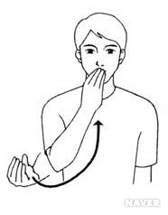 거룩하다 : '코에 생기를 불어 넣는 것'을 상징적으로 구체화한 수화다. <한국수화사전(2007)>