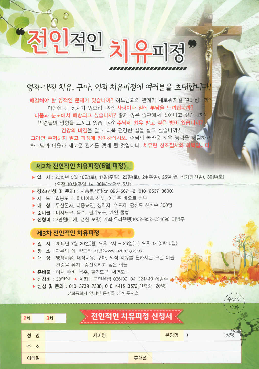 다음날 새벽 “은총을 베풀어주고 싶어도 찾아오는 사람이 너무 적구나"하고 한탄하는 듯한 소리를 듣고 눈을 떴습니다. 이범주 신부님도 자주 말씀하셨듯이 예수님께서는 저희가 치유받아서 깨끗해지고 건강해지기를 원하시는가 봅니다.