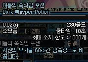 1) 암속성 암속성을 부여하는 방법은 어둠의 속삭임 포션 뿐이다. 다행인 것은 이 포션은 알프라 이라 던전에서 드랍되어 수요가 매우 많고 가격도 상당히 저렴한 편이다.