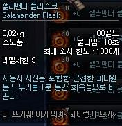 어떤 퀘스트로 얻을 수 있는지 기억이 안나지만(제보 바랍니다.) 딱 5개 얻을 수 있는 걸로 알고 있다. 그리고 끝! 뭐 특성으로는 샐러맨더와 동일하게 파티원들에게도 부여가 가능하니 그저 퀘로 얻으면 용암굴에나 가서 쓰는걸 권장한다. 사실 잭프로스트나 샐러맨더 플라스크같은 경우 예전 로톤에게서 제조가 가능했었으나, 연금술사가 생긴다고 하면서 삭제되었다. 그리고 연금술사는 만들지 못한다. ㅋㅋㅋㅋㅋㅋㅋㅋㅋㅋㅋㅋㅋㅋㅋㅋㅋㅋㅋ