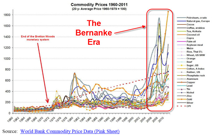 만약 여러분이 최근 몇 년간 우리 경제에 인플레이션이 어떤 영향을 주었는지의 대단히 훌륭한 사례를 보고자 한다면 연준의 무분별한 정책이 원자재 가격에 어떻게 작용하였는지를 보여주는 다음 차트를 보기 바란다.