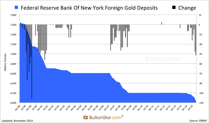 우리가 기다려왔던 숫자이다. 36개국들과 IMF의 공식 보유 금들의 일부를 맡고 있는 뉴욕 연준은 2014년 11월 그 재고가 47톤 하락하는 것을 보았다. 올해 이날까지 뉴욕 연준은 166톤을 유출했다. 뉴욕 연준은 외국들과 IMF의 개별 양이 아닌 얼마나 많은 금을 보관하고 있는지에 대하여만 발표하고 있다.