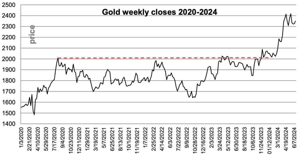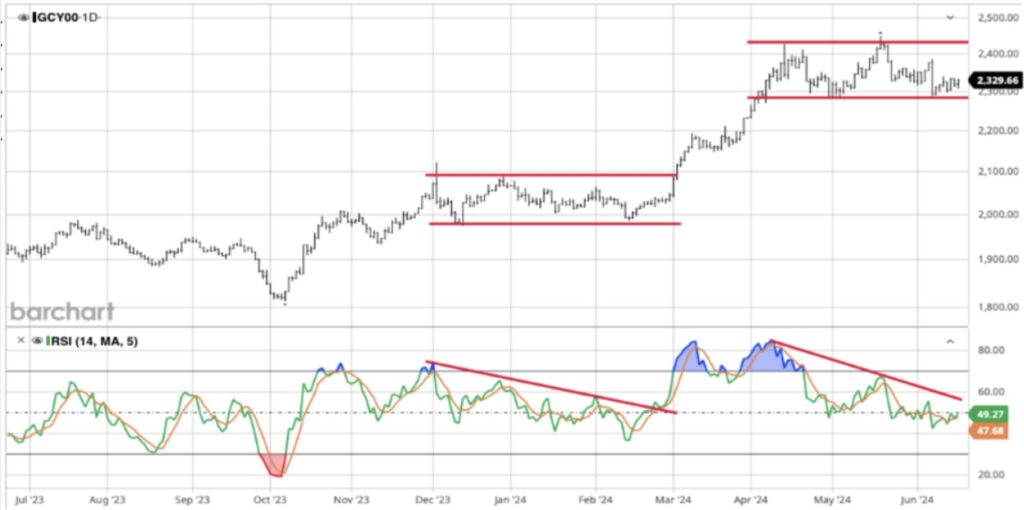 2023년 12월부터 2024년 2월까지 금은 2023년 10월 최저치로부터 상승을 강화하는 범위에서 거래되었다. 금은 그 후 새로운 최고 기록을 경신했지만 지금은 다시 강화되고 있다.