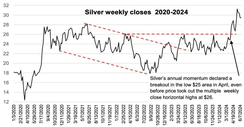 MSA Research 설립자 Michael Oliver: 지난 주 둘 다 모두 소폭 상승했다. 오, 분명하다. 언제나 그랬듯이 주중의 하루하루 행동이 계속해서 사람들을 당황하게 만들고 있다. (금 강세장은 항상 겁을 먹고, 주식 시장 강세는 항상 기쁨과 "영원한 상승"이라는 개념에 도취되어 있는 이유는 무엇입니일까?) 어쨌든, 모든 이전 보고서에서 장기 모멘텀 차트를 보여준 후, 특히 3월과 4월의 주요 장기 모멘텀 기반의 돌파 신호 수준(40주 평균 모멘텀, 100주 모멘텀, 36개월 모멘텀 등)을 정의한 앞서의 보고서 후, MSA는 여러분이 이제 잠시 시간을 내어 가격을 보라고 말한다.