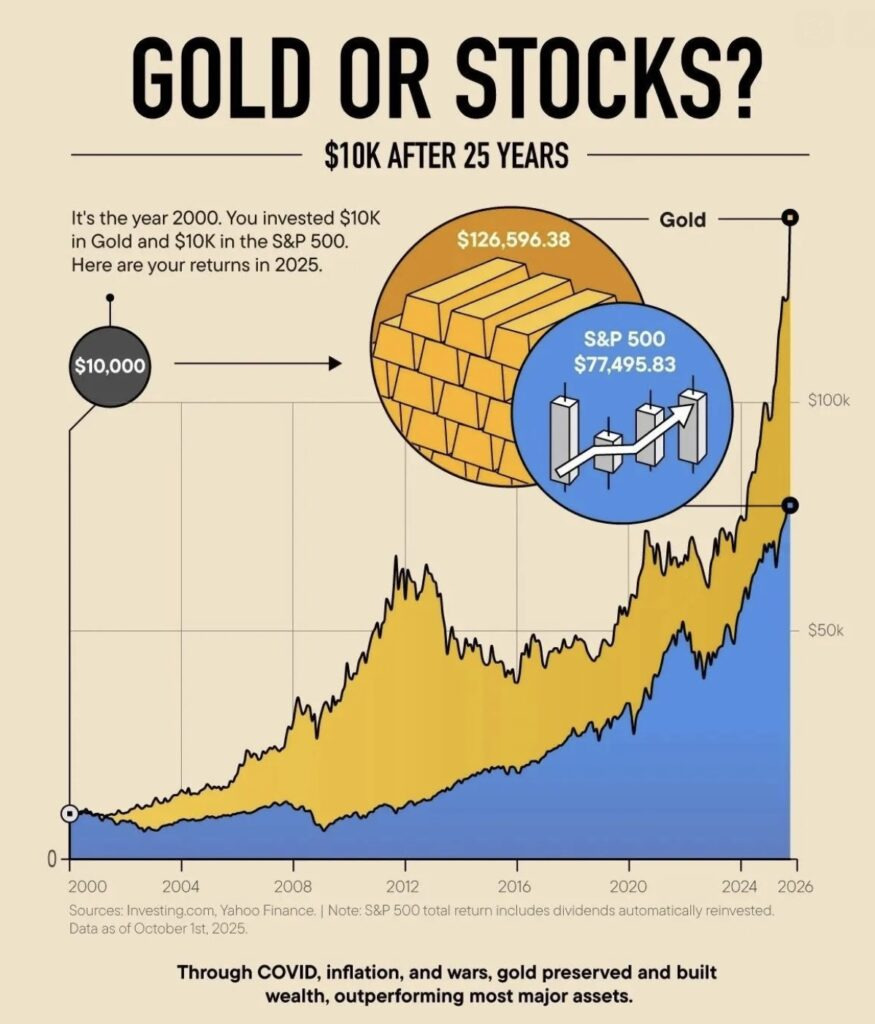25년 후 1만 달러의 가치는 얼마일까? S&P 500 지수에서는 7만 7,495달러로 상승하는데, 꽤 인상적이다. 하지만 금이라면 어떨까? 투자 수익률은 12.6배, 즉 1,160%에 달합니다.