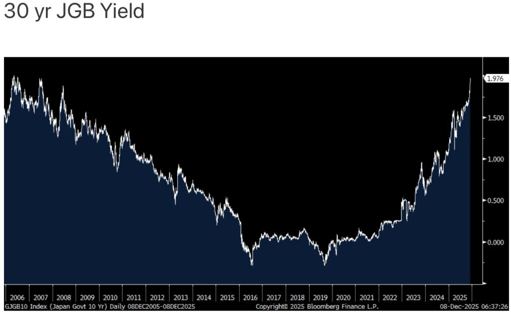 일본은 12월 19일에 금리를 인상해야 하지만, 장기 국채 수익률 곡선은 이미 좁아진 것이 분명하다. 10년 만기 국채 금리는 10월 마지막 날 대비 30bp 상승하여 오늘 1.98%(1.976%에서 반올림)로 19년 만에 최고치를 경신했다. 올해 들어 87bp 상승하여 거의 두 배 가까이 상승했다.