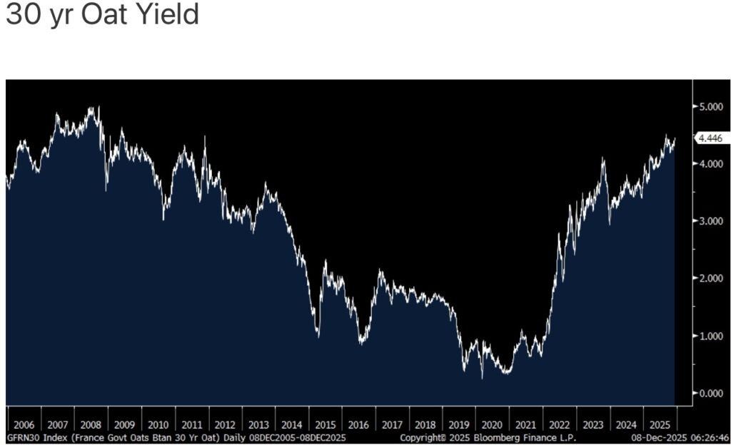 프랑스 30년 국채 수익률은 2009년 이후 마지막 수준에서 불과 5bp 하락했으며, 2024년 6월 이후 거의 100bp 상승했다.