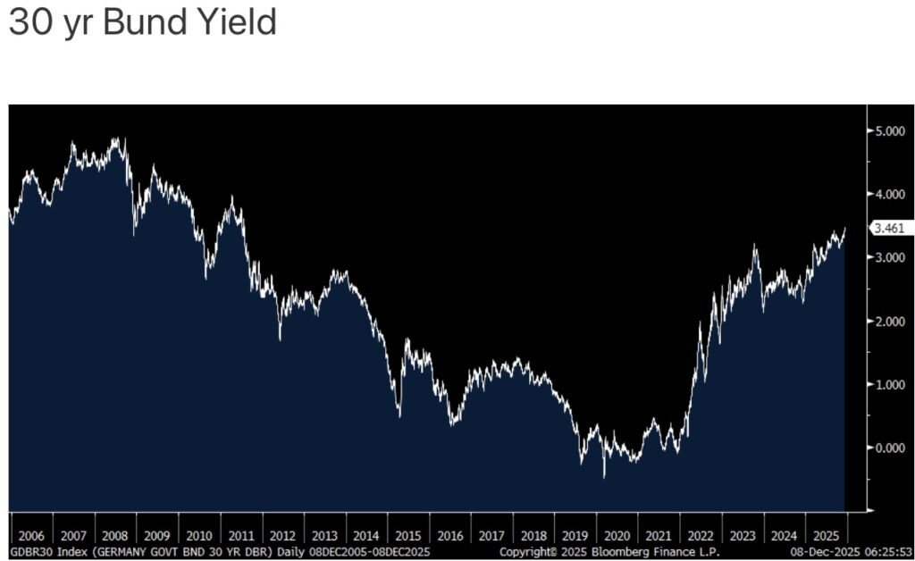 Peter Boockvar: 그렇다. 유럽중앙은행은 2024년 6월 이후 예금 금리를 200bp 인하하여 2%로 낮췄지만, 독일 30년 국채 수익률은 현재 2011년 7월 이후 최고 수준인 3.46%로 거래되고 있으며, 2024년 6월 초 이후 약 70bp 상승했다.