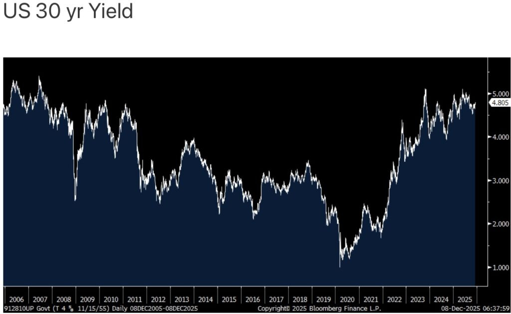 영란은행은 2024년 7월에 금리를 인하하기 시작했으며, 30년 만기 수익률은 9월 초에 기록된 수십 년 만기 최고치에서 떨어졌지만, 2024년 7월 초 이후 약 60bp 상승했다. 현재 미국 30년 만기 수익률은 4.81%로, 연준이 금리 인하 주기를 시작하기 위해 50bp를 인하한 2024년 9월 이후 약 90bp 상승했으며, 4.81%인 2024년 4월 최고 수익률로 돌아갔다.