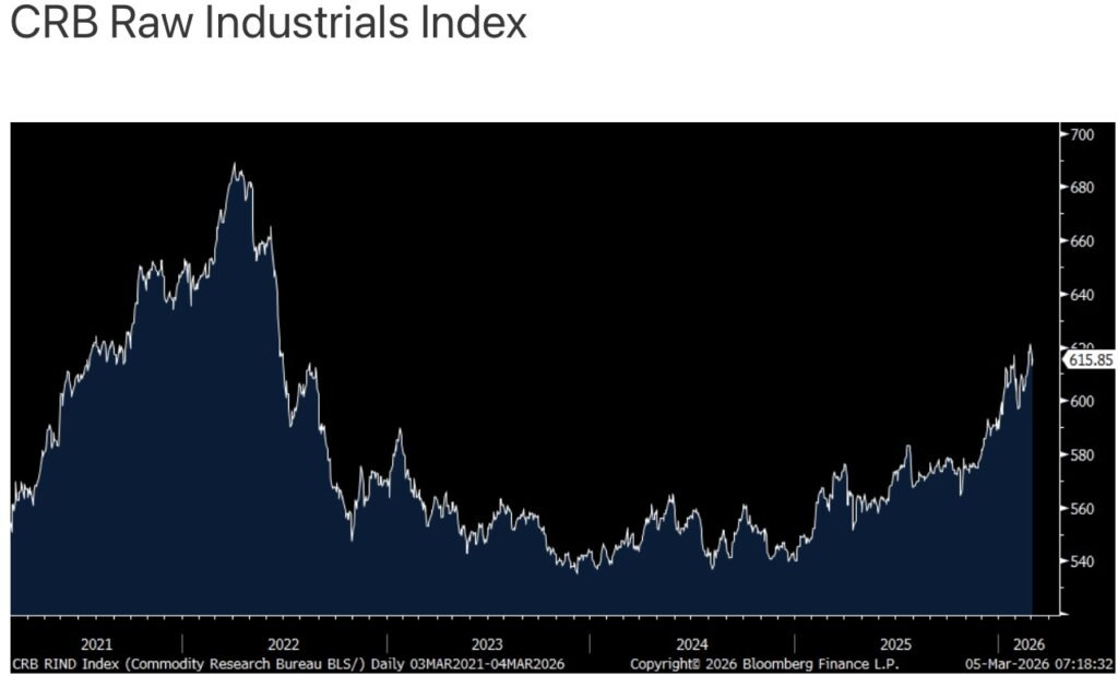 여러 가지 상황을 고려했을 때, CRB 원자재 산업지수는 2022년 6월 이후 최고치에 근접한 수준을 보이고 있다.