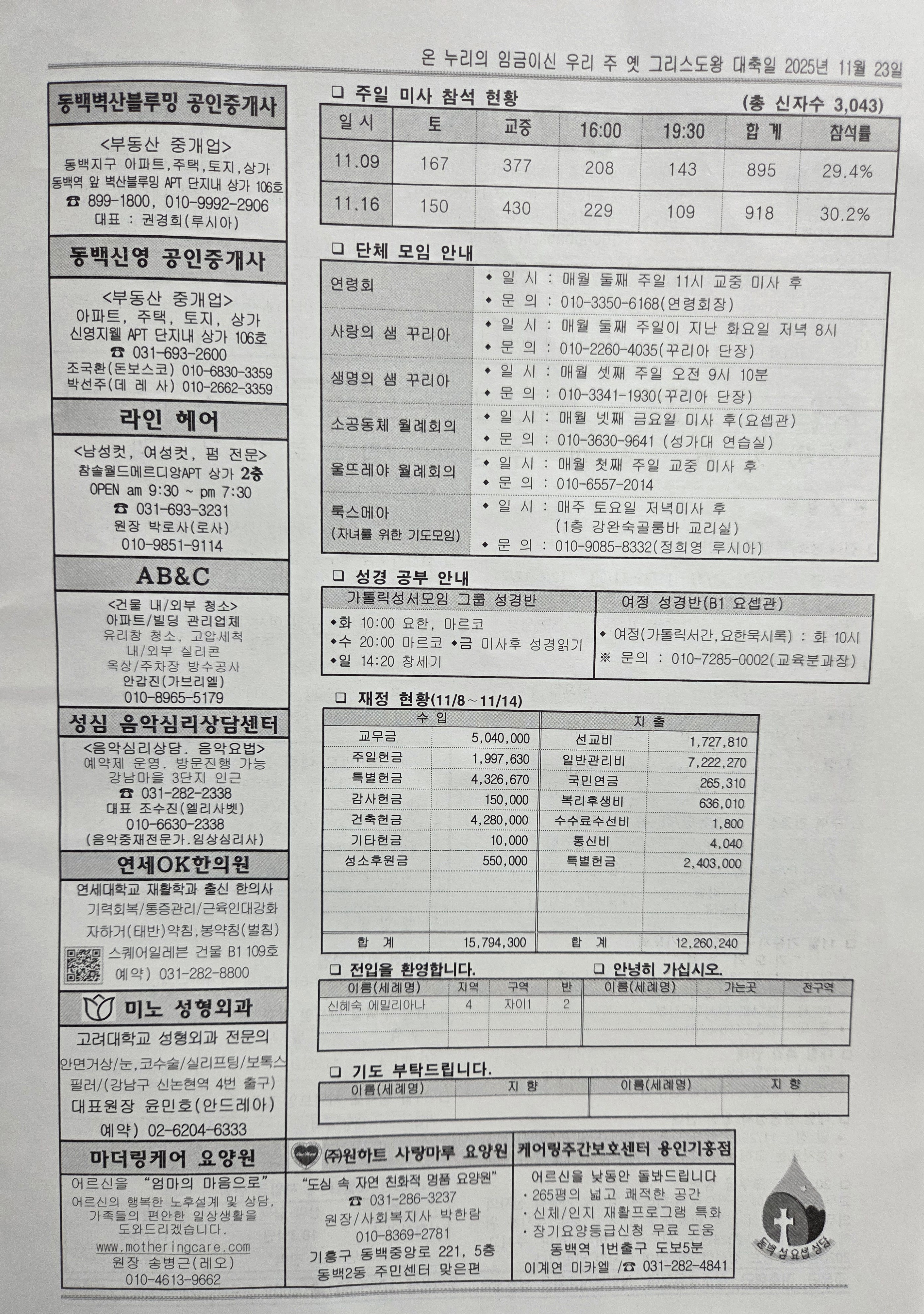 2025년 11월 23일 (그리스도왕 대축일) 주보 작성자이강욱다니엘|작성시간25.11.23|조회수111 목록 댓글 0 글자크기 작게가 글자크기 크게가 2025년 11월 23일 (그리스도왕 대축일) 주보 입니다 다음검색 현재 게시글 추가 기능 열기 북마크 공유하기 신고 센터로 신고 댓글 댓글 0 댓글쓰기 답글쓰기 댓글 리스트