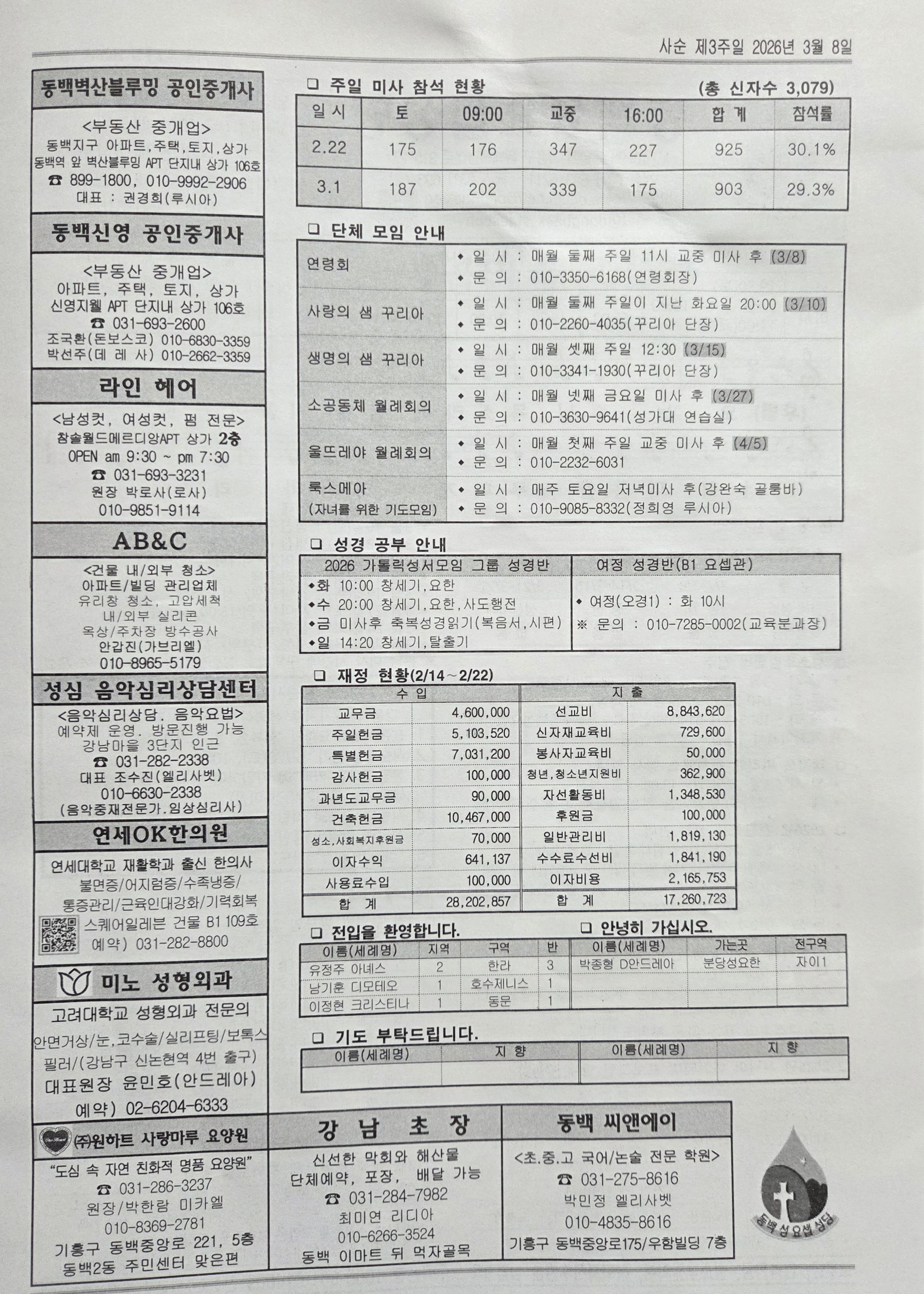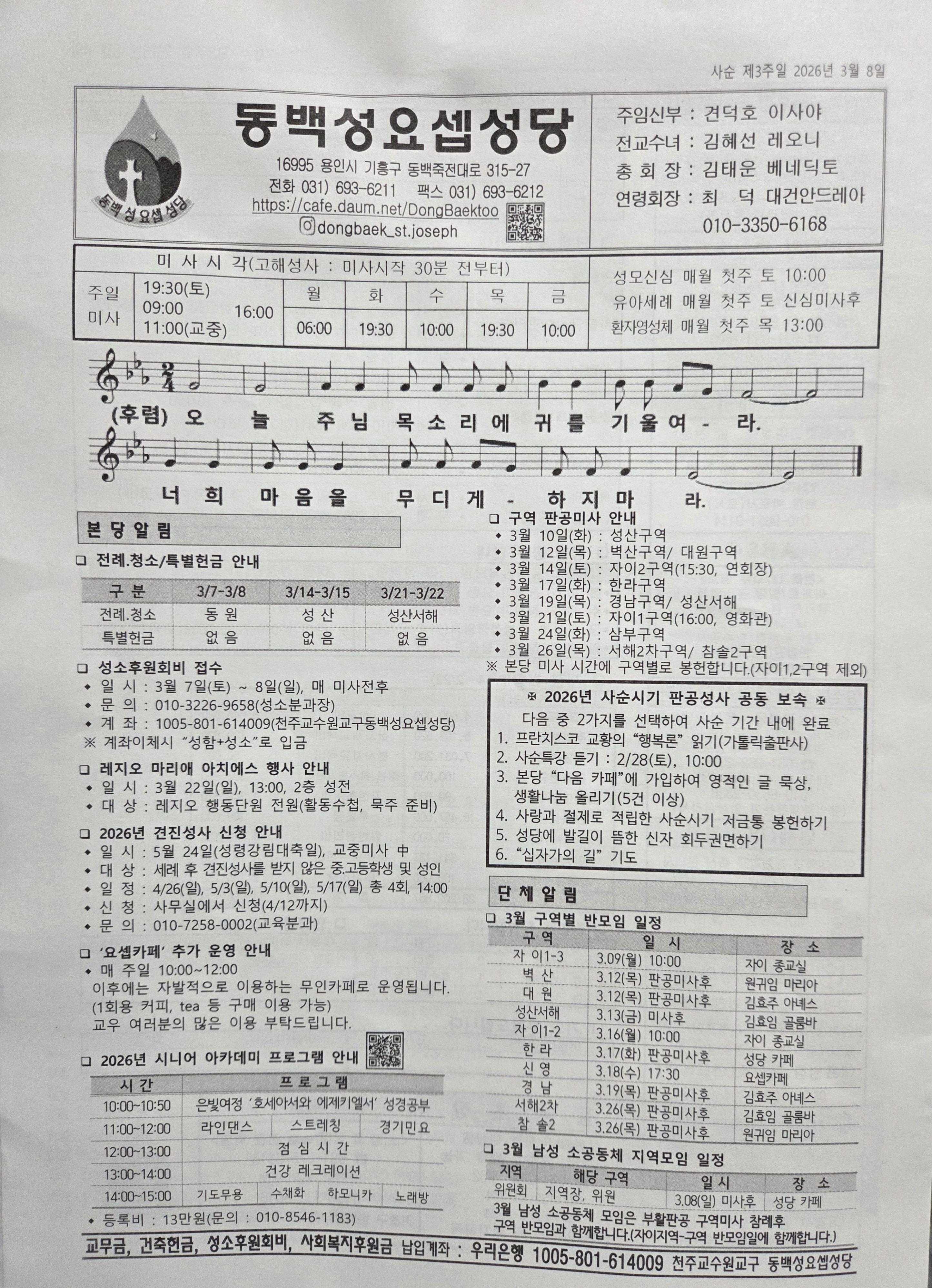 2026년 3월 8일 (사순 제3주일) 주보 작성자이강욱다니엘|작성시간26.03.08|조회수133 목록 댓글 0 글자크기 작게가 글자크기 크게가 2026년 3월 8일 (사순 제3주일) 주보 입니다 다음검색 현재 게시글 추가 기능 열기 북마크 공유하기 신고 센터로 신고 댓글 댓글 0 댓글쓰기 답글쓰기 댓글 리스트