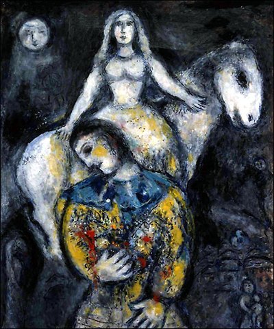 <하얀 여곡마사와 광대>, 1965. 캔버스 위에 유화, 100 x 72cm 모나코, 개인소장. Ecuyere blanche avec clown, 1965 Huile/toile, 100 x 72 cm. Monaco, Private collection