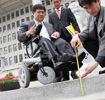 ★...한나라당 장애인위원회 윤석용 의원당선자측과 장애인편의시설촉진시민연대 등이 23일 국회 본청 입구에서 장애를 가진 민원인들의 불편 사항 등을 점검하고 있다. 이들은 국회를 방문하는 장애인들의 제반시설 점검을 계기로 전국의 편의시설 점검 등 단계적 계획을 수립하여 장애인의 이동권 확보에 힘을 쏟겠다고 했다. /연합뉴스 ▒☞[출처]조선일보 |