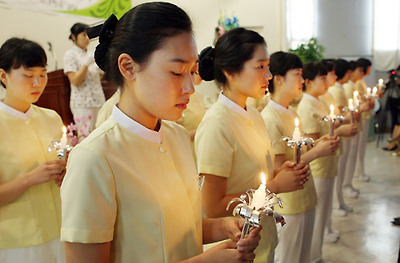 ★...제주대학교 의과대학 간호학과 3학년 학생 17명이 임상실습을 시작하기에 앞서 23일 오전 의과대학 세미나실에서 촛불을 켜고 나이팅게일의 간호정신을 계승하기 위한 선서식을 갖고 있다. /연합뉴스 ▒☞[출처]조선일보