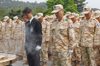 ★...이라크 평화 재건사단 교대병력 8진 2차 장병 300명이 23일 동작동 국립 서울현충원을 방문, 참배하고 있다. /연합뉴스 ▒☞[출처]조선일보 |