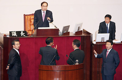 ★...정운천 농림수산식품부 장관 해임건의안 투표가 진행된 23일 국회 본회의 의장석 앞에서 임채정 국회의장, 통합민주당 김종률(왼쪽부터), 임종석, 최재성 의원, 한나라당 안상수 원내대표가 투표 지연을 두고 설전을 벌이고 있다. 투표결과는 총 149명의 의원이 참석 중 찬성 140표, 반대 5표, 기권 2표, 무효 2표로 부결. /연합뉴스 ▒☞[출처]조선일보 |