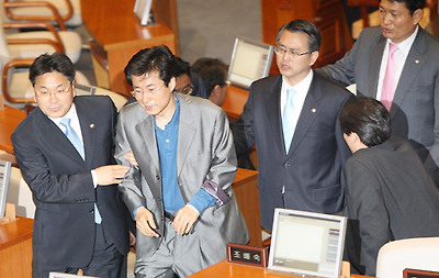 ★...23일 국회 본회의장에서 정운천 농림식품부 장관 해임건의안 투표를 마친 민주당 장경수 의원이 동료의원들의 부축을 받고 회의장을 나서고 있다. /연합뉴스 ▒☞[출처]조선일보 |