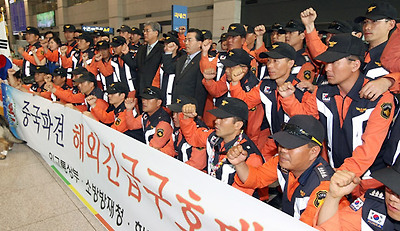 ★...지난 16일 중국 쓰촨성 지진 피해현장에 파견됐던 119국제구조대가 인명탐색과 구조활동 등 임무를 마치고 23일 인천국제공항을 통해 귀국, 입국장에서 귀국보고회를 가진 뒤 파이팅을 외치고 있다. /연합뉴스 ▒☞[출처]동아일보 |