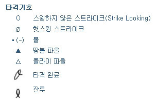 투구마다 각각 해당기호를 적어넣습니다. 특히 타격의 완료(4사구나 삼진이 아닌 진루 또는 아웃이 되는 상황)를