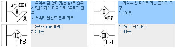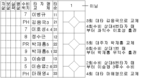 그림에서처럼 수비 때 교체됐을 경우 교체 이닝과 교체 당시 상대팀 타순을 적어줍니다. (이진영, 박재홍, 이승엽의 경우)