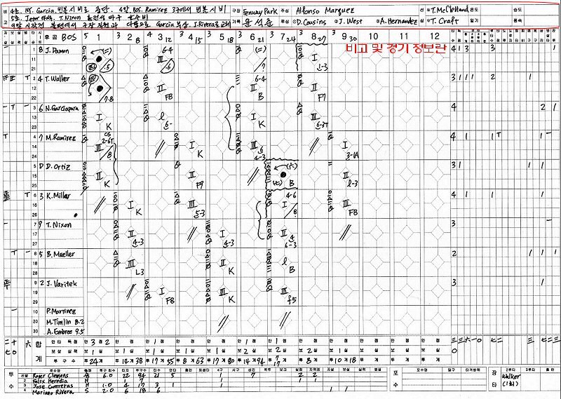 1) 위는 각타자별 기록란으로 매이닝 볼카운트, 각베이스에서 벌어진 상황과 득점 등을 기록합니다.