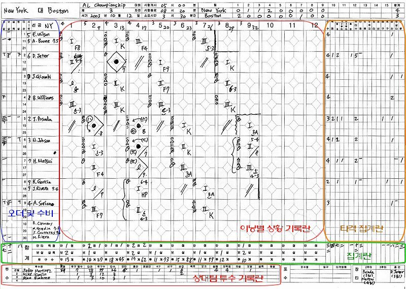 아래는 지난 2003/10/12 메이저리그 아메리칸리그 챔피언쉽 3차전 경기기록을 직접 한 뒤 스캐닝한 것입니다.