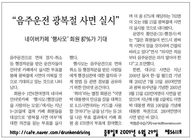 음주운전 광복절 사면 실시" 네이버카페 "행사모" 회원 87%가 기대(중부일보) 작성자곰돌이|작성시간09.06.29|조회수524 목록 댓글 0 글자크기 작게가 글자크기 크게가 http:cafe.naver.com/drunkendriving 다음검색 현재 게시글 추가 기능 열기 북마크 공유하기 신고 센터로 신고 댓글 댓글 0 댓글쓰기 답글쓰기 댓글 리스트