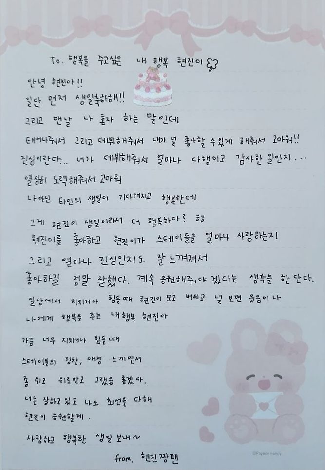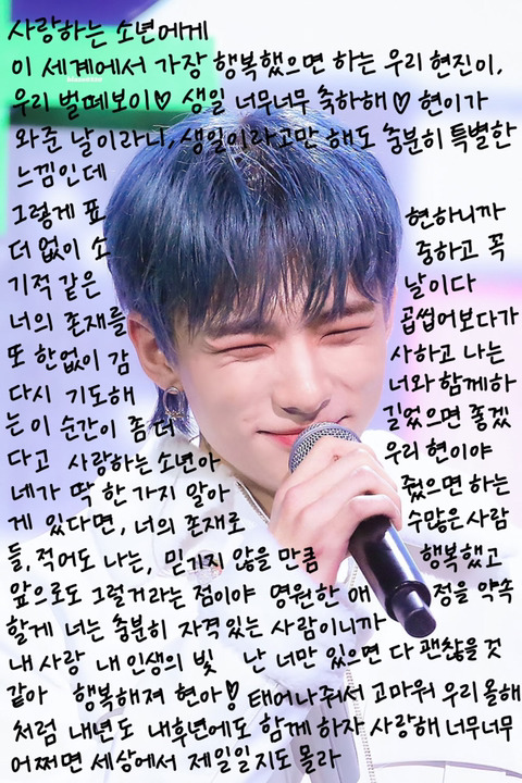 난 어떻게 보면 팬들이 보내는 사랑이 가장 순수하고 깨끗한 거 같아. 사랑은 늘 이긴다는 말 처럼 우리는 사랑하는 시간동안 늘 웃게될거야. 가장 순수하고 강한 만두들아 ! 현진이처럼 너희도 빛난다는 걸 잊지마렴❣️