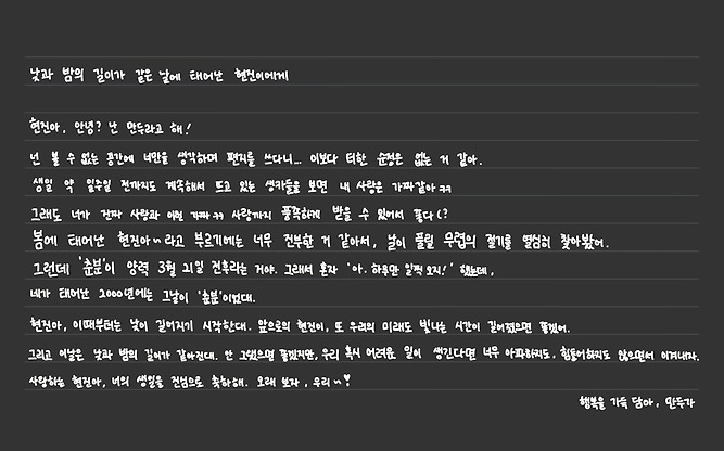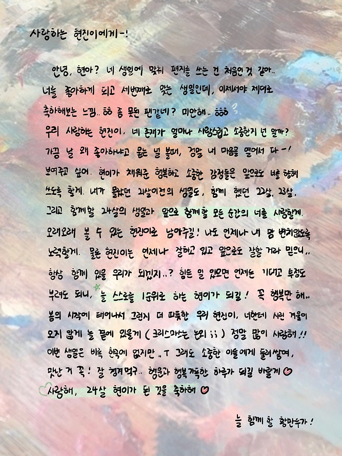 만두들아… 현진이 생일이라니… 믿겨지지가 않는다 현달이 부흥하고 난 다음에… 너희들이랑 맨날 현진이 생일에~ 현진이 생일에~ 이런 말 했었는데 진짜 이 날이 오네… 너희들이랑 현진이 생일을 같이 보낼 수 있어서 너무 기쁘다 너희도 그렇지?? 같이 현진이 생일 준비하고 같이 기다리고 같이 보낼 수 있다는 게 얼마나 감사한지 몰라 이 시간이 안 끝났으면 좋겠어… 괜찮아 너희들이랑 다음 해에도 다음 해에도 함께일 거니까 그치?? 진짜 진심인데 너희를 황현진만큼 아껴… 아니 황현진보다 더 사랑할 지도 모름 진짜로;; 먼훗날에 우리가 현진이를 한 발자국 뒤에서 응원하게 되는 날이 오더라도 너희들이랑은 늘 함께였으면 좋겠을 만큼… 아 갑자기 눈물나네 너희랑 안 헤어지고 싶어 나는!!!! 그러니까 방석 망할 때까지 달글에 꼬옥 붙어있어 나도 그럴게.. 그리고 기왕이면 현진이라는 존재가 오래오래 우리의 결속이었으면 좋겠다 만두들아!! 너무너무 기쁜 날이야 모든 만두가 즐겁게 보내길 바라 그리고 앞으로도… 사랑해! 이 말을 몇 번이나 해야 내 진심이 전해질지 모르겠다 그냥 한 번 더 할게 진짜진짜 진심으로 사랑해~♡