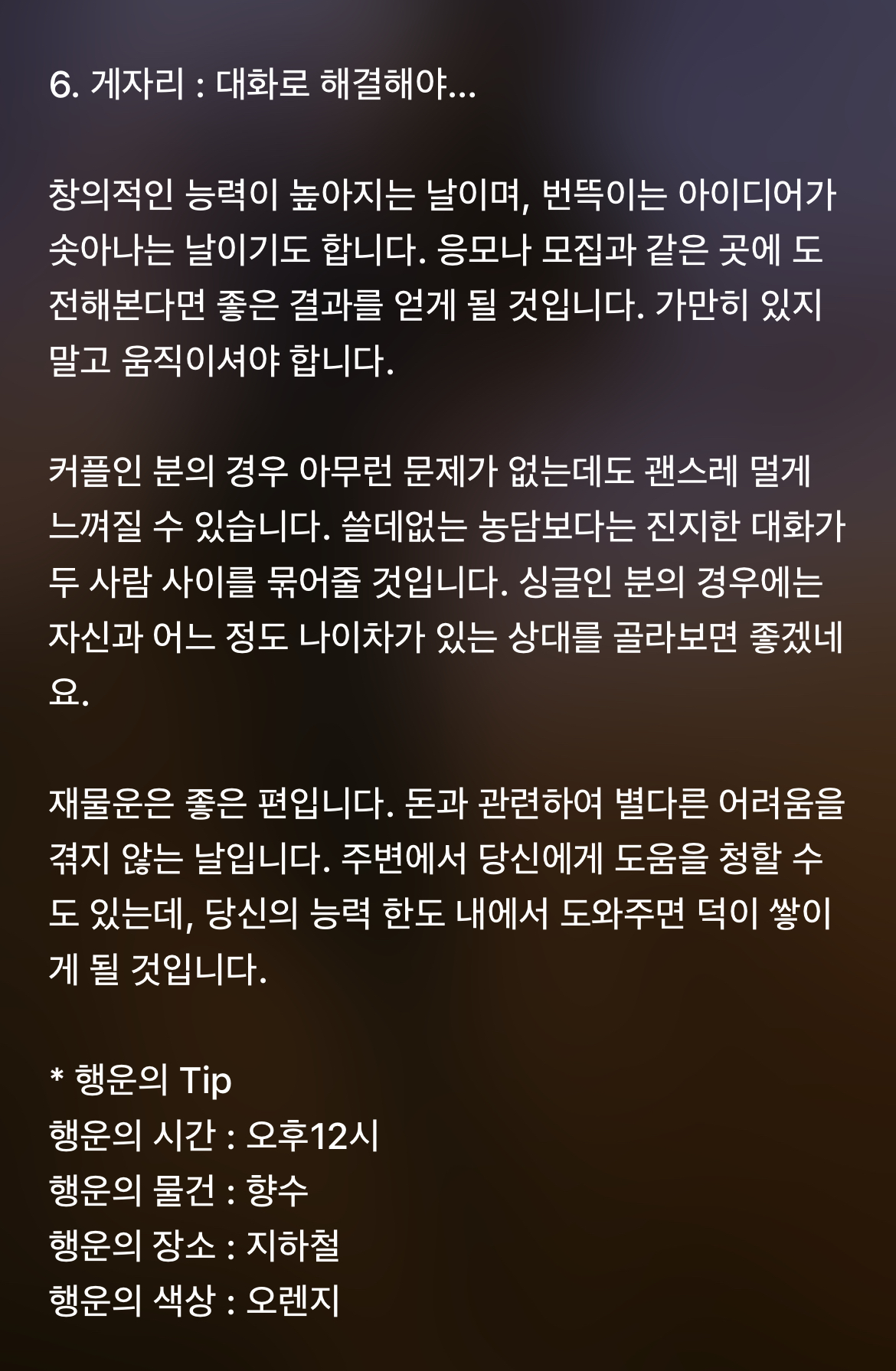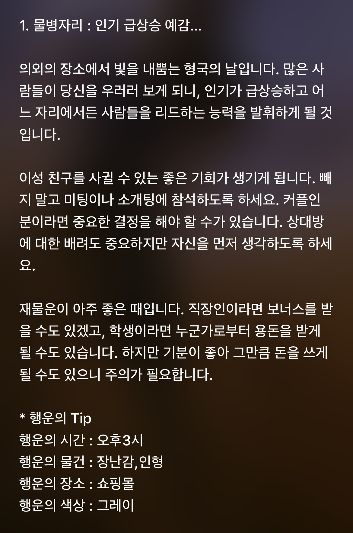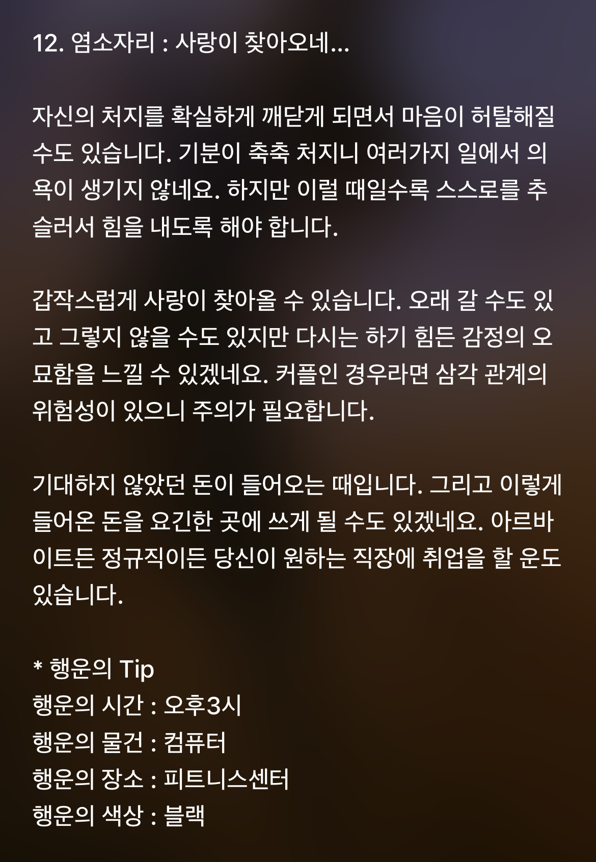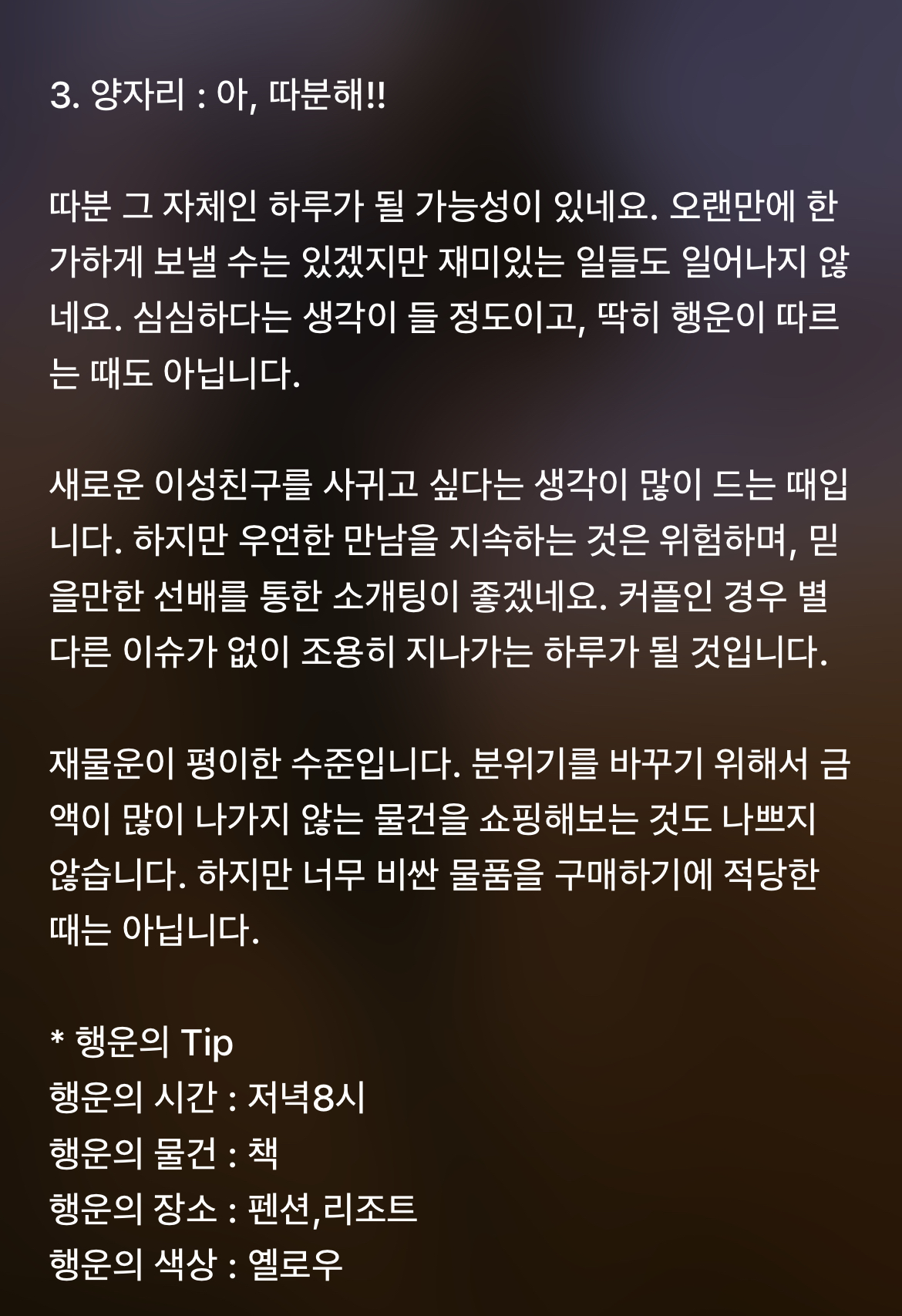 [기타]하루전에 미리보는 11월 26일 별자리운세 작성자바리요정|작성시간21.11.25|조회수5,159 목록 댓글 45 글자크기 작게가 글자크기 크게가 1차 출처 : 산수도인2차 출처 : 피키캐스트 다음검색 현재 게시글 추가 기능 열기 북마크 공유하기 신고 센터로 신고 댓글 댓글 45 댓글쓰기 답글쓰기 댓글 리스트 작성자B..BH | 작성시간 21.11.26 복채 작성자방탄 김남준 | 작성시간 21.11.26 복채♡ 작성자NewYork | 작성시간 21.11.26 복채 작성자Still dreaming | 작성시간 21.11.26 복채 작성자INSIDE OUT | 작성시간 21.11.27 복채 댓글 전체보기