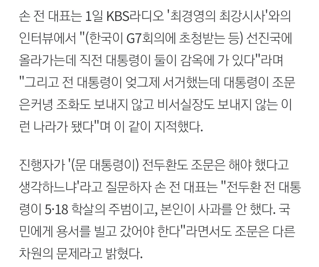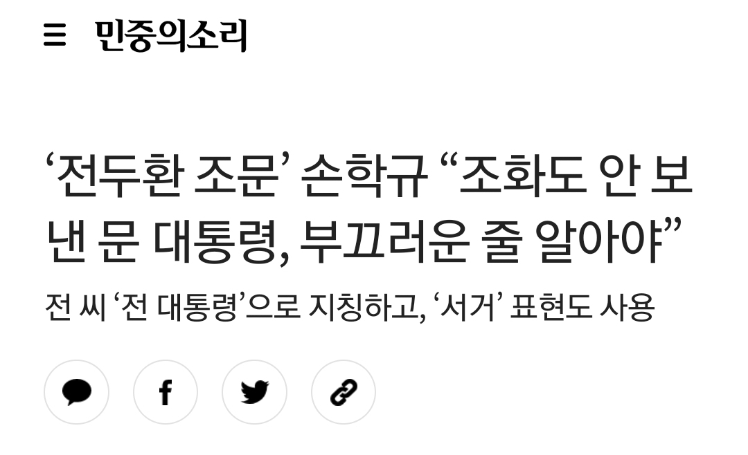 [사회]‘전두환 조문’ 손학규 “조화도 안 보낸 문 대통령, 부끄러운 줄 알아야” 작성자울림아 기죽지마|작성시간21.12.02|조회수813 목록 댓글 22 글자크기 작게가 글자크기 크게가 ...? 🤔https://www.vop.co.kr/A00001604086.html네 번째 대선 출마 선언 손학규, 전두환 조문 안 했다고 문 대통령 힐난그는 전 씨의 사망을 두고 ‘서거’라 표현했다.www.vop.co.kr 다음검색 현재 게시글 추가 기능 열기 북마크 공유하기 신고 센터로 신고 댓글 댓글 22 댓글쓰기 답글쓰기 댓글 리스트 작성자태형에게 | 작성시간 21.12.02 니나 잘해.. 작성자그게되나 적당히좋아하는게 | 작성시간 21.12.02 웩 작성자금봉 | 작성시간 21.12.03 니는 그냥 산에 들어가라 다시 작성자청순김정우 | 작성시간 21.12.03 ? 미친새낀가? 작성자올리브영 | 작성시간 21.12.03 하 댓글 전체보기