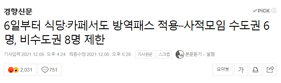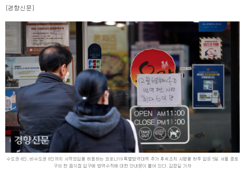 정부는 ‘거리 두기’를 다시 소환했다. 6일 0시부터 4주 동안 사적모임 최대 인원은 수도권 6명, 비수도권 8명으로 제한한다. 실내체육시설, 노래연습장, 목욕장 등 일부 고위험시설에만 적용하던 방역패스는 식당·카페 등 이용 빈도가 높은 다중이용시설로 확대한다. 식당·카페를 비롯해 학원, PC방, 영화관, 공연장, 도서관, 독서실, 스터디카페 등을 이용할 땐 접종완료 후 2주가 지났다는 증명서나 유전자증폭(PCR) 음성확인서가 필요하다. 다만 미접종자라도 식당이나 카페를 혼자 이용할 땐 방역패스를 적용하지 않는다. 식당·카페에서 사적모임을 가질 경우 미접종자를 1명까지 허용한다.