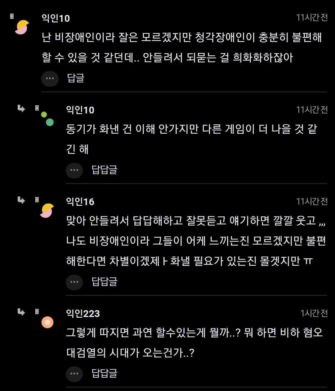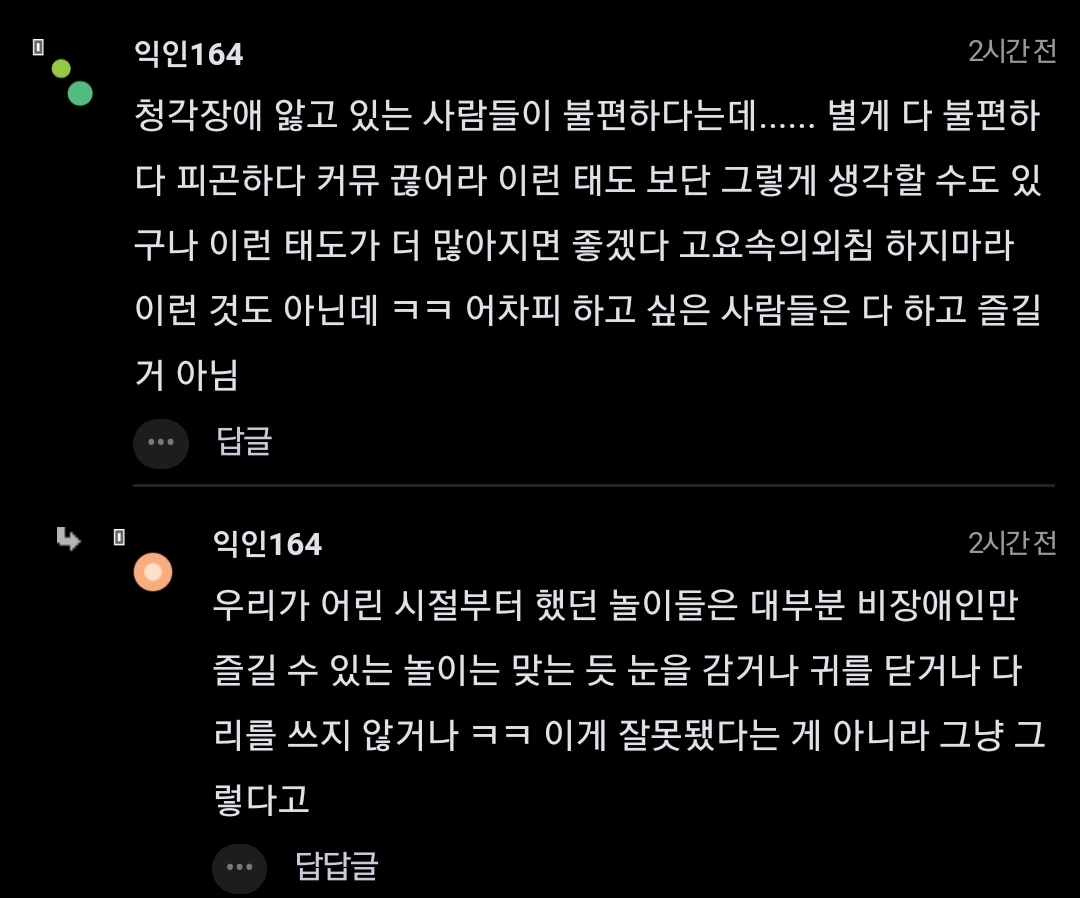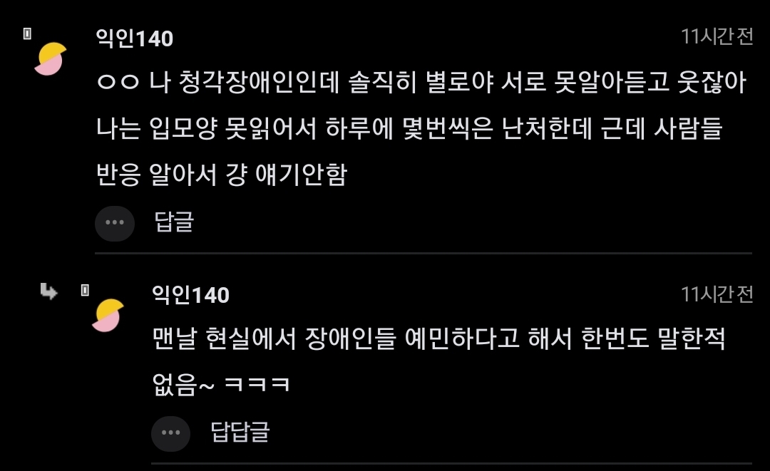 난 주변에 청각장애인 친구가 있어서 비장애인임에도 이 게임이 너무너무 싫어. 비장애인은 아무 문제 없이 되는 기본적인 의사소통에 대한 불편함을 희화하는 것처럼 보임. -