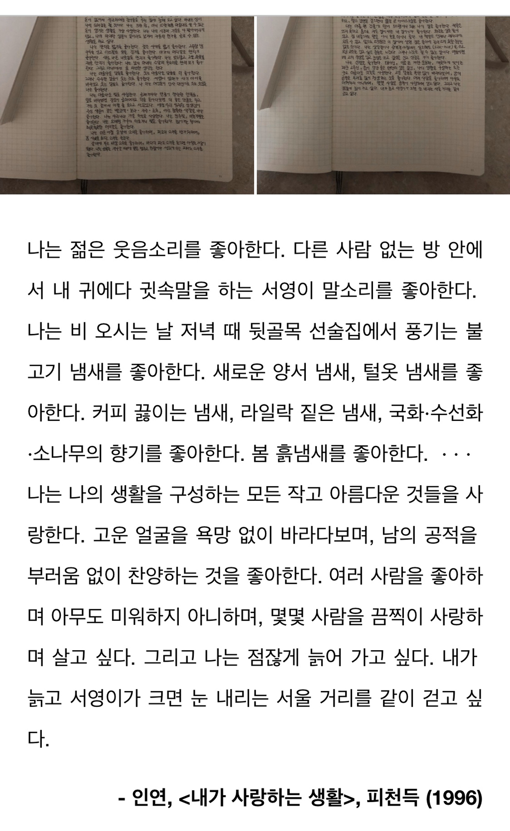 책을 처음부터 끝까지 쓰는 것보단 읽다가 마음에 드는 페이지, 문단만 적어보면 나중에 내가 뭐 읽었는지 기억도 새록새록나고 한권 다 채우면 묘하게 성취감도 들어