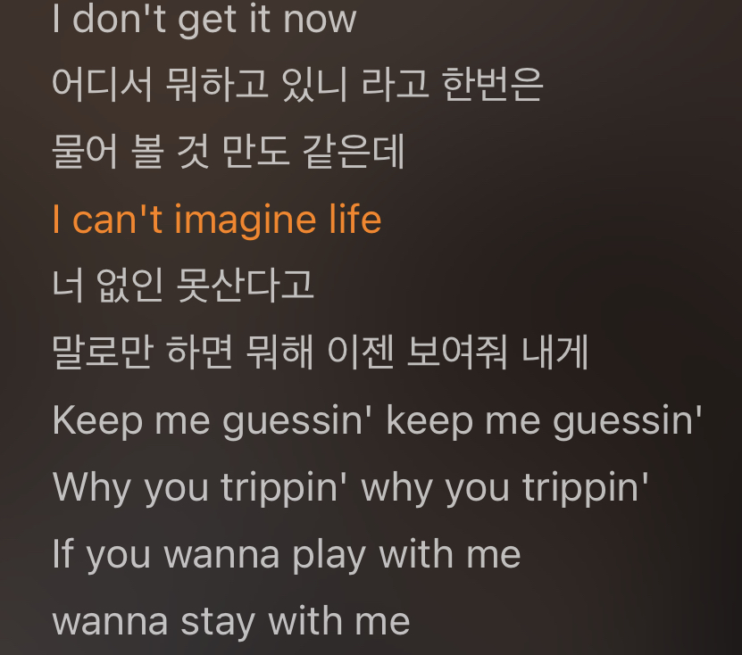 뭔가 이중적인 의미가 보이는 것 같아 가사 해석 없이 들리는 노래로써는 사랑 노래로 너 없이 못 살아ㅠㅠ 이런 느낌인데