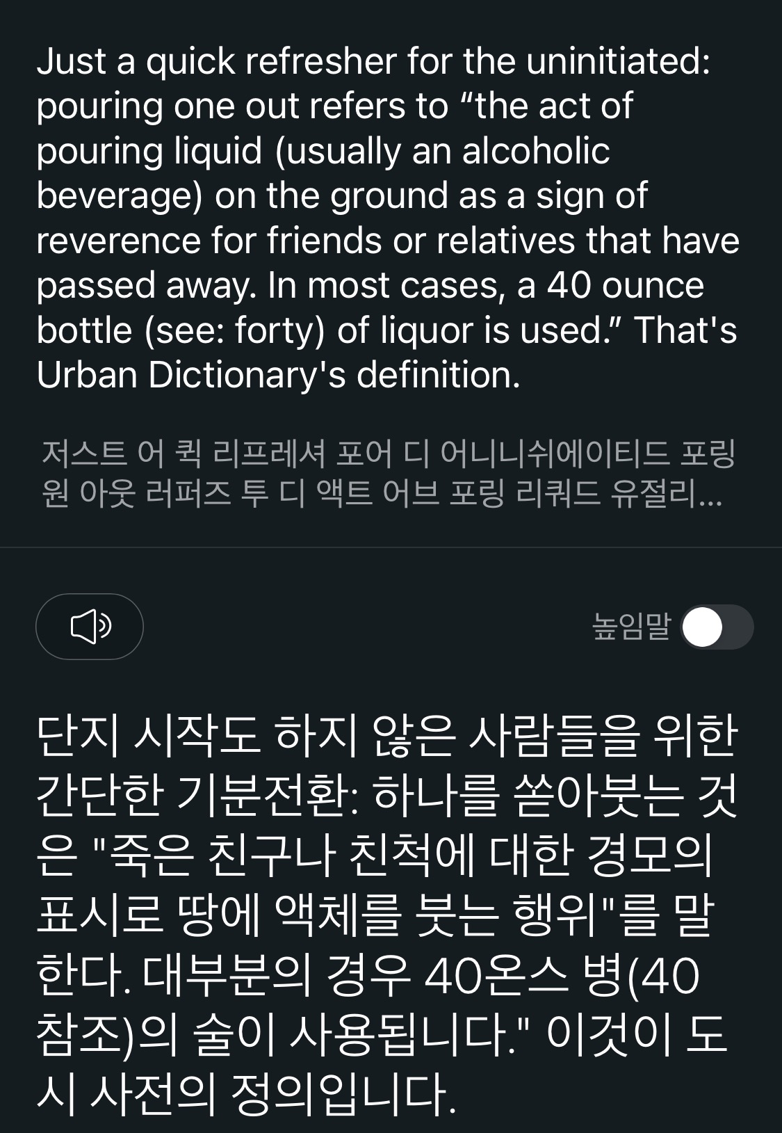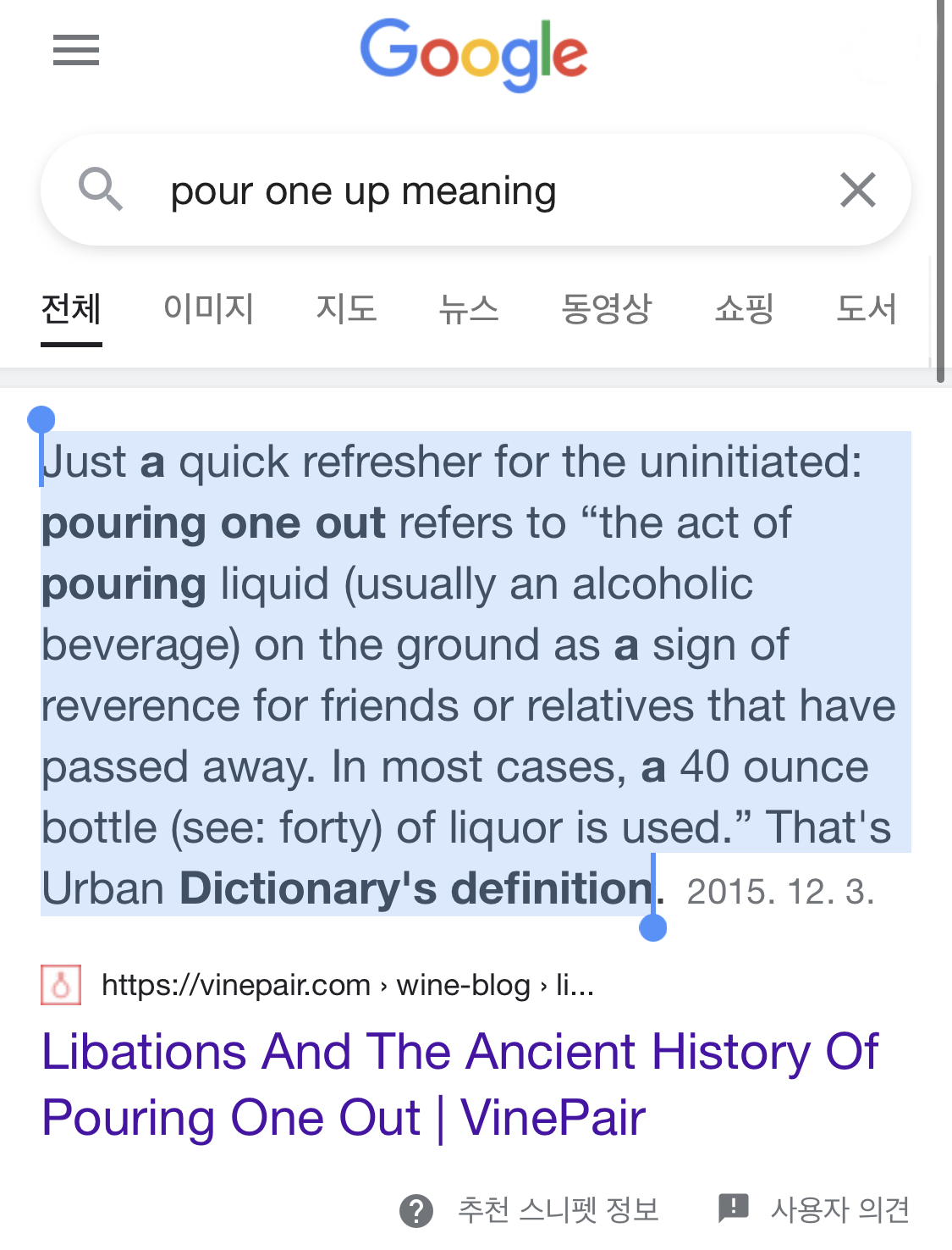 자 그리고 대망의 would you pour one up. (액체의 무언가를) 따라줄래? 라는 얘기인데 장례식장에서 술 먹고 그런 얘기를 말한건가? 싶었는데