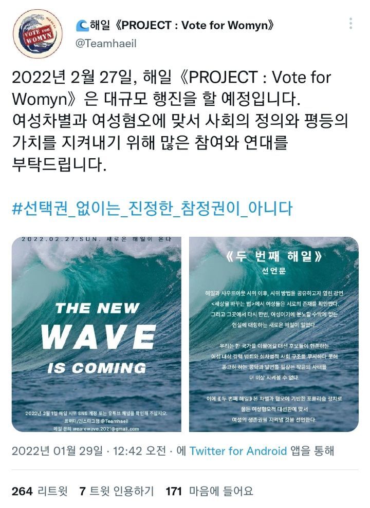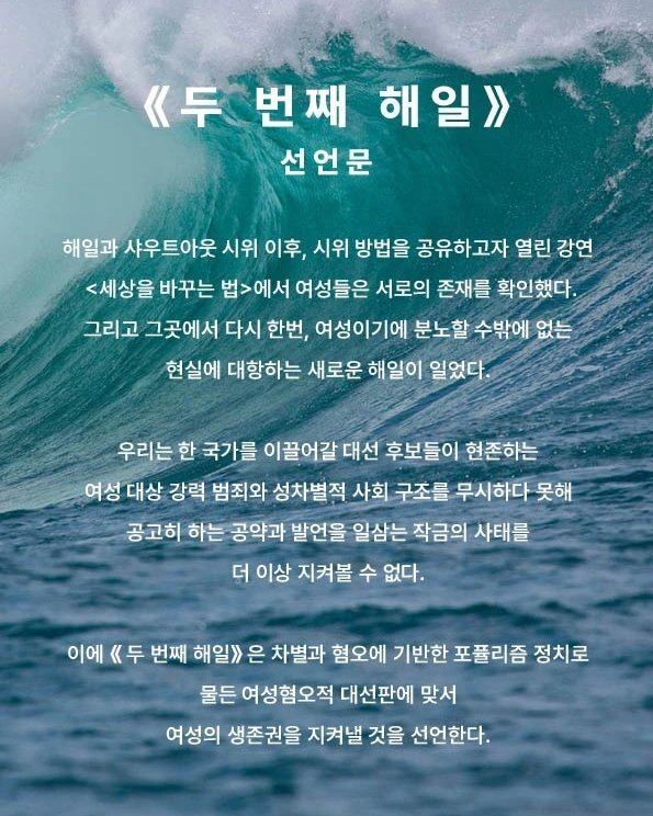 [페미니즘]대규모 행진을 기획한 해일팀 작성자사십칠분|작성시간22.01.29|조회수525 목록 댓글 3 글자크기 작게가 글자크기 크게가 https://twitter.com/Teamhaeil/status/1487088724051562510?t=Zm_5RhXKnnucbL9WQuTXCQ&s=19🌊해일《PROJECT : Vote for Womyn》 on Twitter“2022년 2월 27일, 해일《PROJECT : Vote for Womyn》은 대규모 행진을 할 예정입니다. 여성차별과 여성혐오에 맞서 사회의 정의와 평등의 가치를 지켜내기 위해 많은 참여와 연대를 부탁드립니다. #선twitter.com 다음검색 현재 게시글 추가 기능 열기 북마크 공유하기 신고 센터로 신고 댓글 댓글 3 댓글쓰기 답글쓰기 댓글 리스트 작성자도복숭 | 작성시간 22.01.29 가보자고 작성자리치망고스틴리젤 | 작성시간 22.01.29 멋있어 작성자SEHUNEE | 작성시간 22.01.29 가보자고 댓글 전체보기
