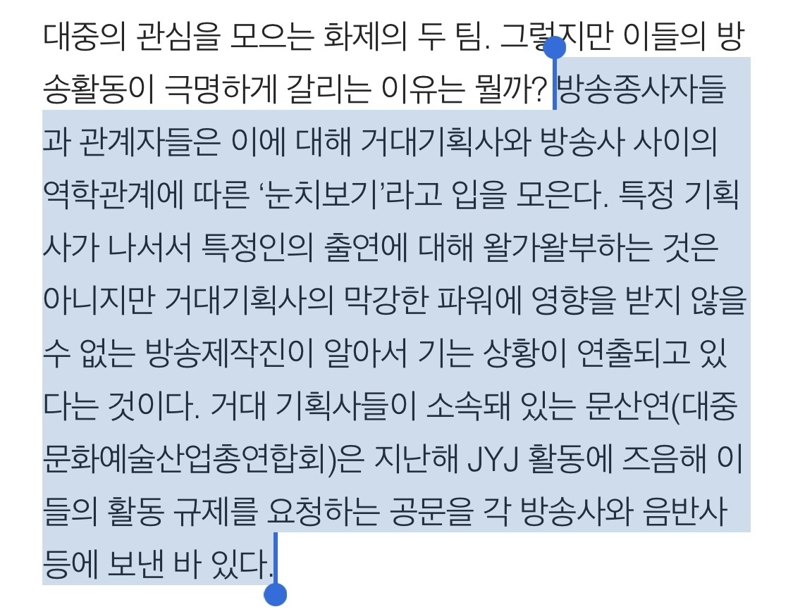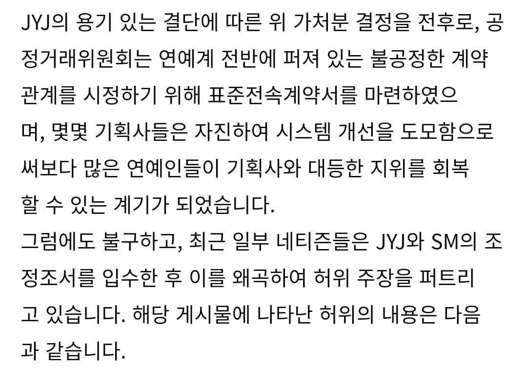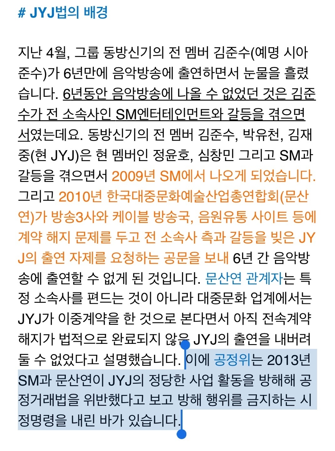 '2013년 SM과 문산연이 JYJ의 정당한 사업 활동을 방해해 공정거래법을 위반했다고 보고 방해 행위를 금지하는 시정명령을 배린 바가 있습니다.'