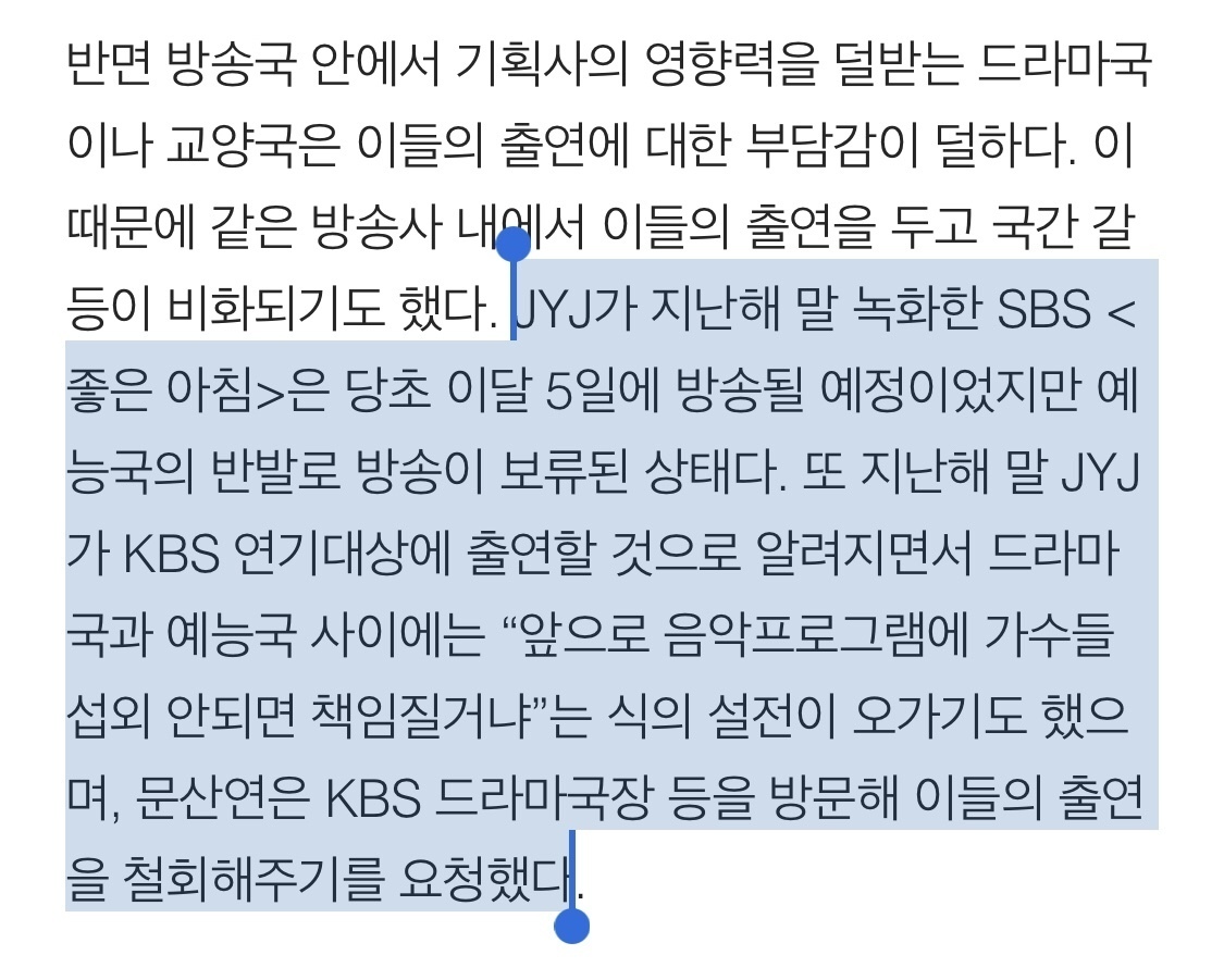 또 지난해 말 JYJ가 KBS 연기대상에 출연할 것으로 알려지면서 드라마국과 예능국 사이에는 “앞으로 음악프로그램에 가수들 섭외 안되면 책임질거냐”는 식의 설전이 오가기도 했으며, 문산연은 KBS 드라마국장 등을 방문해 이들의 출연을 철회해주기를 요청했다.