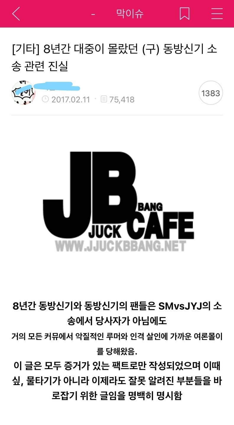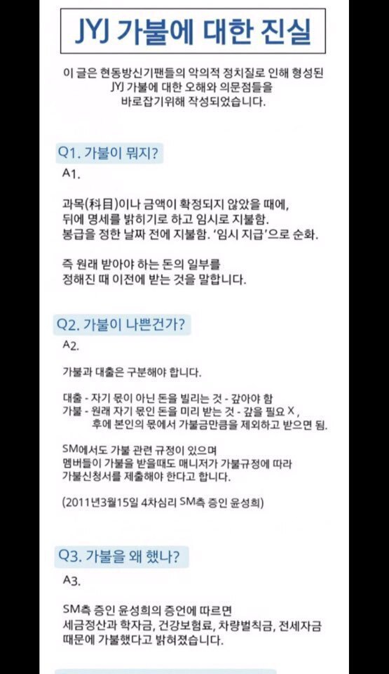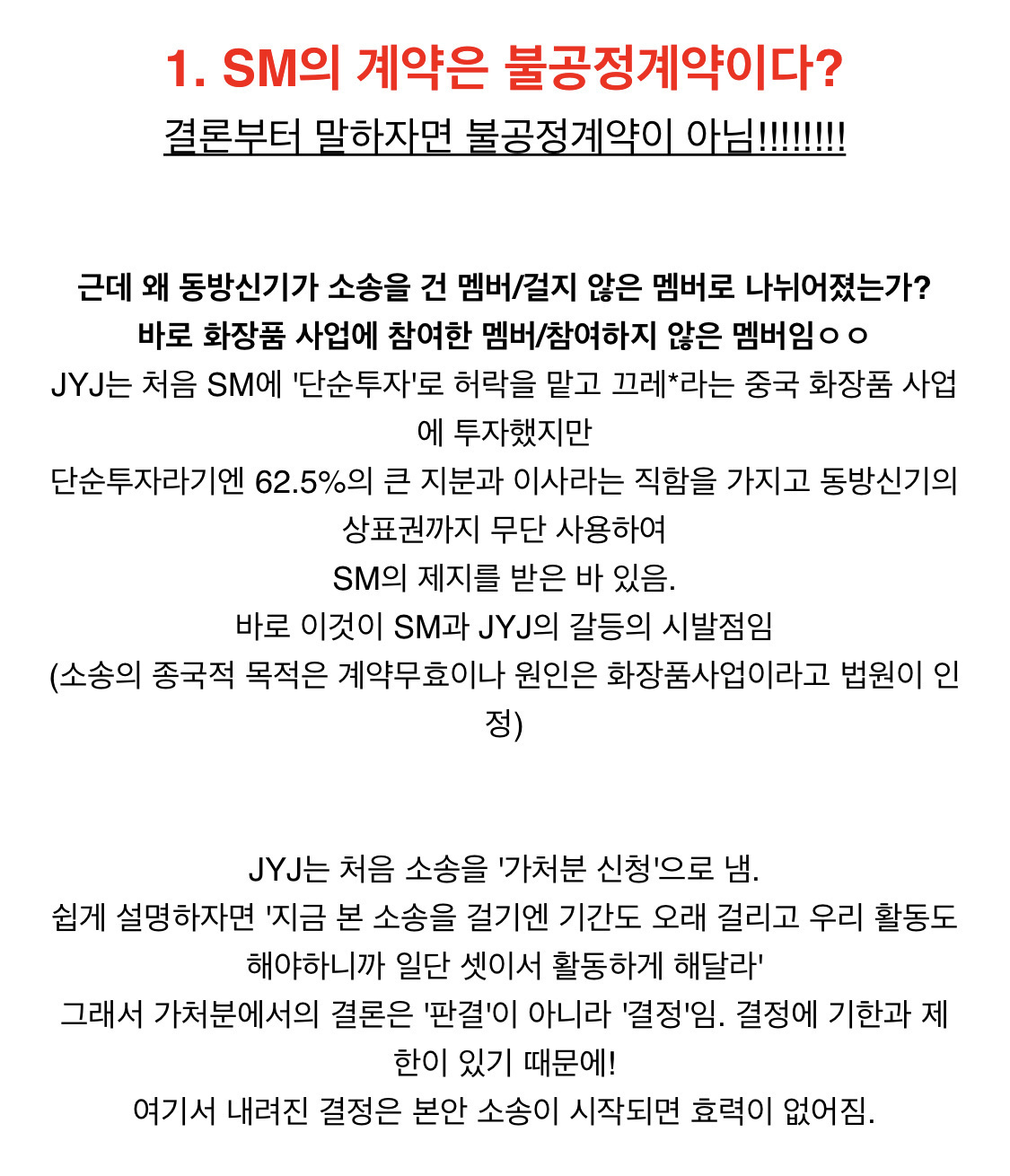 | 맨 아래 간단요약 있음 지난 2017년 2월 모 카페에 올라온 하나의 글은 최초 작성자가 허위사실 유포로 고소를 당했음에도 불구하고 해당 내용이 사실이 되어 여러 커뮤에 퍼졌고, 가해자에게 향해야 하는 비난의 화살이 여전히 피해자에게 향하고 있음 바로 이 글인데 이 글에 대해 그리고 이 소송의 진실에 대해 이야기 함에 앞서, 나는 현 동방신기의 팬이면서 동시에 김준수와 김재중의 팬임을 밝히고 시작함. 응, 나 양쪽에서 욕쳐먹는 올팬(이라고 쓰고 빵녀라고 읽지)이니깐 한쪽에 악의적인 글이니 어쩌니 하지말라고 우선 저 글의 내용을 잠깐 살펴보면, 첫 문장부터 개소리임. 중간 내용 스킵하고 맨 마지막의 다섯줄 요약을 보면.. 2번도 개소리임. 3번은 적반하장임. 4번은 개싸움 될까봐 진짜 참는다..임 (참고로 가족은 건들지 말자 주의라서 더 말 안하는데 나는 가족관련 자료 양 쪽 다 가지고있음) 5.이제사 무슨말을 하냐 싶어서 걍 말 안함..ㅎ 이게 한번만 올라왔으면 참 좋았을텐데, 이때가 박유천 그 사건터지고 나서라 이미지 존나 안좋을때라서인지 끌올이 엄청 됐고 쭉빵뿐 아니라 여기저거 이 자료가 퍼졌음. 뭐...중요한건 이 루머가 모 카페(ㅉ...읍읍)에서 시작됐다는거지. 다시말하지만, 저 게시글은 루머임. 첫 문장부터 거짓말이니깐. 내가 이 글을 쓰려고 오늘 한시간?정도 전에 캡쳐했었는데, 조회수 보여? 댓글수 얼마 없는거 같지? 저거 댓삭한거야. 뭐 악플러가 고소 안당하면 원래 사과 안하잖아 암튼, 내가 저기서 4번이랑 5번은 개싸움나니깐 별로 반박하고 싶지도 않고 반박할 이유도 가치도 없다고 느끼니깐 패스하고 개인적으로 가장 빡치는 그리고 지들도 막상 겪으면 고용노동부로 뛰쳐갈 계약서 부분에 대해서 먼저 이야기 할게 사실 이건 다들 알거라고 생각했어. 너무 유명하니깐. 응, 존나 유명하니깐. 너무나도 유명하고 기사만 찾아봐도 다들 아니깐. 근데 참, 아무도 찾아보지도 않고 욕부터 박드라. 난 진짜 하다하다 소속사한테 자아의탁하는건..진짜 처음봤어 SM이 그렇게 좋나...? 왜 좋지 난 Hug때부터 ㅈ같았는데 지금도 ㅈ같고 앞으로 ㅈ같을 놈들인데..취향 한번..존중이 안되네 뭐 자세한건 아래에 씨제스가 올려준 공지와 함께 합의서 전문을 올릴테니 그걸 다 읽어보고 혹여나 법률적인 부분에서 막힌다면 주위의 변호사에게 문의하길 바라고 먼저 쉽게 설명된 유투브를 가져왔어. SM에 다섯명이 동방신기로 있었을 당시 JYJ가 소송을 걸었던 그 계약 내용이 어땠는지 정리된 내용이야 이게 정당하고 생각된다면 앞으로 평생 이런 계약조건으로 살아갔음 좋겠어. 본인도 본인의 가족도 그리고 덕질하면 덕질하는 대상도. 유투버 마산너구리님 께서 동방신기의 노예계서의 내용에 대해 정리한거야. 출처: https://youtu.be/ch_zxN-5SmQ 참고로 당시 동방신기의 계약 조건은 SM내에서도 업계에서도 가장 좋은 조건이었어. |