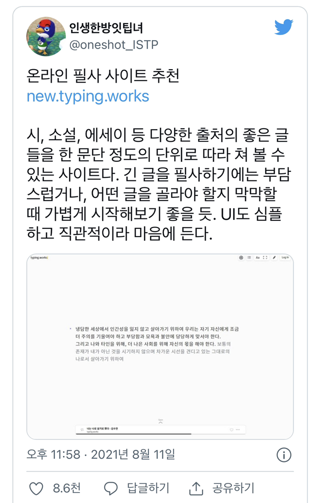 시, 소설, 에세이 등 다양한 출처의 좋은 글들을 한 문단 정도의 단위로 따라 쳐 볼 수 있는 사이트다. 긴 글을 필사하기에는 부담스럽거나, 어떤 글을 골라야 할지 막막할 때 가볍게 시작해보기 좋을 듯. UI도 심플하고 직관적이라 마음에 든다.