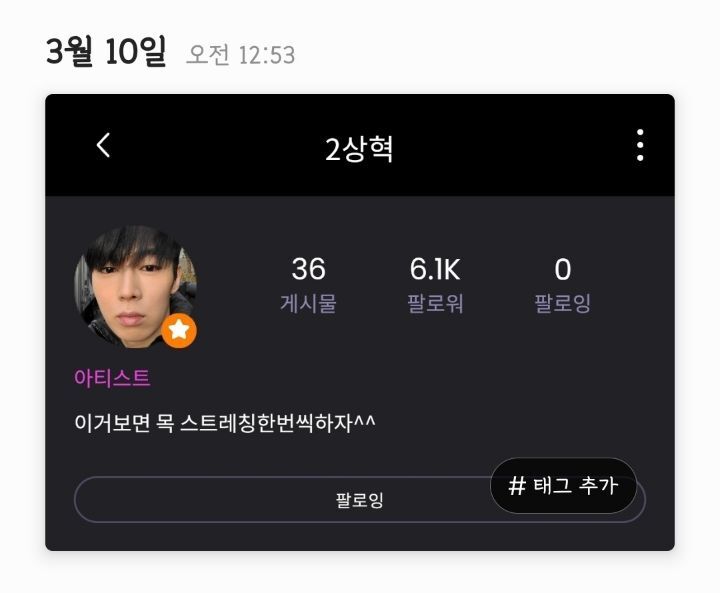 도수치료와 보험얘기 이후에 이거 보면 목스트레칭 한번씩 하라고 상메에 올린겁니다. 제가 목디스크 얘기를 안했어도 저 상메를 올렸을까요? 팬이 목디스크로 아프다고 하니까 다들 볼 수 있는곳에 이거 확인하면 스트레칭 한번씩 해주자 이렇게 올린거라고 생각합니다.
