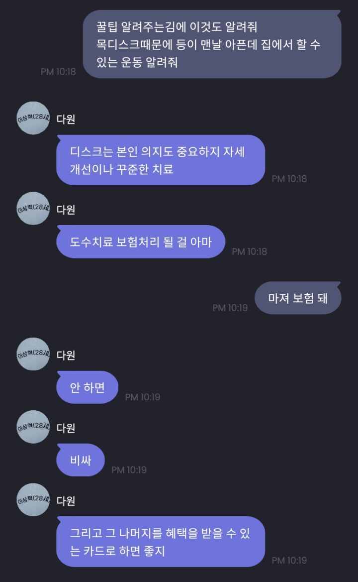 한참 팬들에게 이것저것 유용한 팁을 알려주고 있었던 상황이었고 평소에 매일 운동하는 다원이었기에 혹시 보면 관련 운동 알려줄수 있지 않을까 싶어서 목디스크가 있어서 등이 아프다 운동 알려줄 수 있냐고 보냈고 답장으로 디스크에 대한 얘기를 받았습니다.