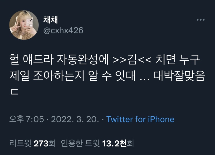 [기타]실시간 트위터에서 인용 1만 넘은 트윗 작성자Film|작성시간22.03.29|조회수5,763 목록 댓글 213 글자크기 작게가 글자크기 크게가 https://twitter.com/cxhx426/status/1505485571115814913?s=21채채 on Twitter“헐 얘드라 자동완성에 >>김<< 치면 누구 제일 조아하는지 알 수 잇대 ... 대박잘맞음 ㄷ”twitter.com김철 다음검색 현재 게시글 추가 기능 열기 북마크 공유하기 신고 센터로 신고 댓글 댓글 213 댓글쓰기 답글쓰기 댓글 리스트 작성자김남준. | 작성시간 22.03.29 김남준 작성자방나라 | 작성시간 22.03.29 김남준 작성자복숭아재현 | 작성시간 22.03.29 김도영 작성자사람이 사랑하면 안돼요 | 작성시간 22.03.30 김치 작성자제시카입니다 | 작성시간 22.04.08 김하성 댓글 전체보기