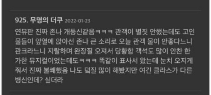 아니 뮤지컬은 일반인도 많이 가고 내가 맨날 공연장 가는것도 아니고 모를수 있는데 고나리 당하는거 기분 나쁨