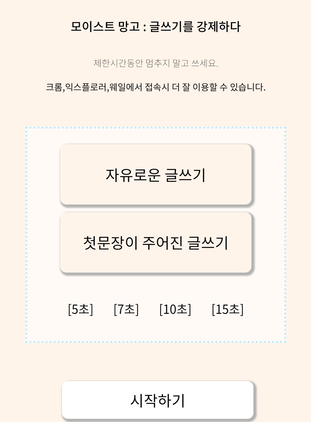 글 형식과 타이머 시간을 고르고 시작하기!