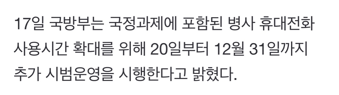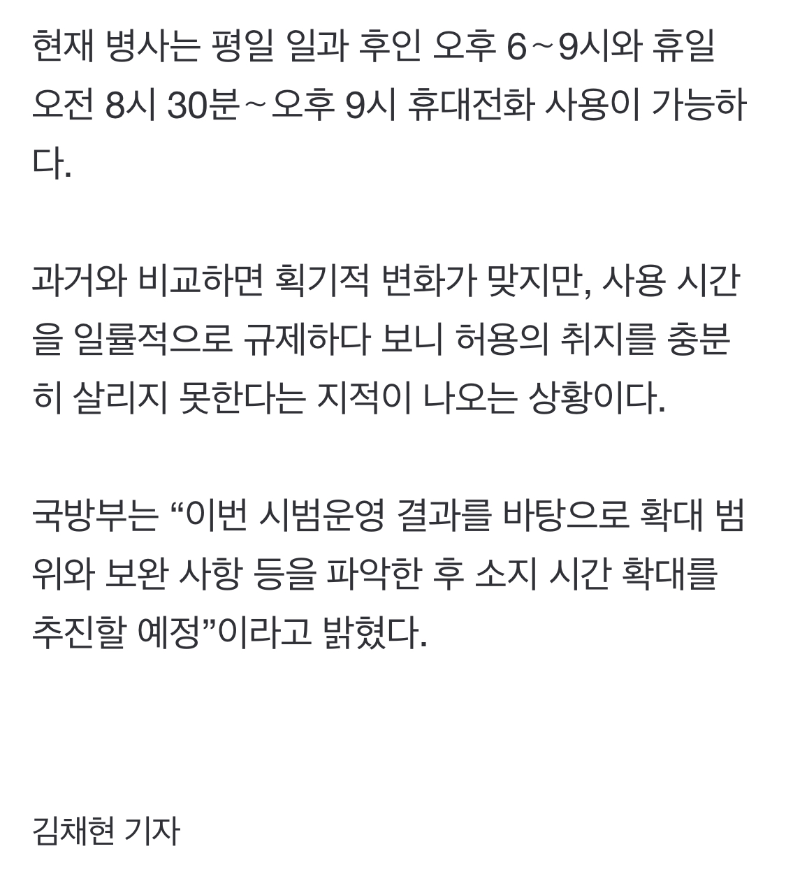 [사회][속보]군대서 ‘24시간 휴대전화’ 사용 가능할듯 작성자화이트펄|작성시간22.06.17|조회수694 목록 댓글 16 글자크기 작게가 글자크기 크게가 https://n.news.naver.com/article/081/0003280765 다음검색 현재 게시글 추가 기능 열기 북마크 공유하기 신고 센터로 신고 댓글 댓글 16 댓글쓰기 답글쓰기 댓글 리스트 작성자태양계 | 작성시간 22.06.17 수련회가 더 군대 같을 듯 작성자오이 | 작성시간 22.06.17 엥 작성자deepdeep | 작성시간 22.06.17 훈련하면서 셀카도 찍겠네 작성자초향 | 작성시간 22.06.17 놀러 감? 작성자말랑물복빙수 | 작성시간 22.06.17 진짜 개꿀이네 댓글 전체보기